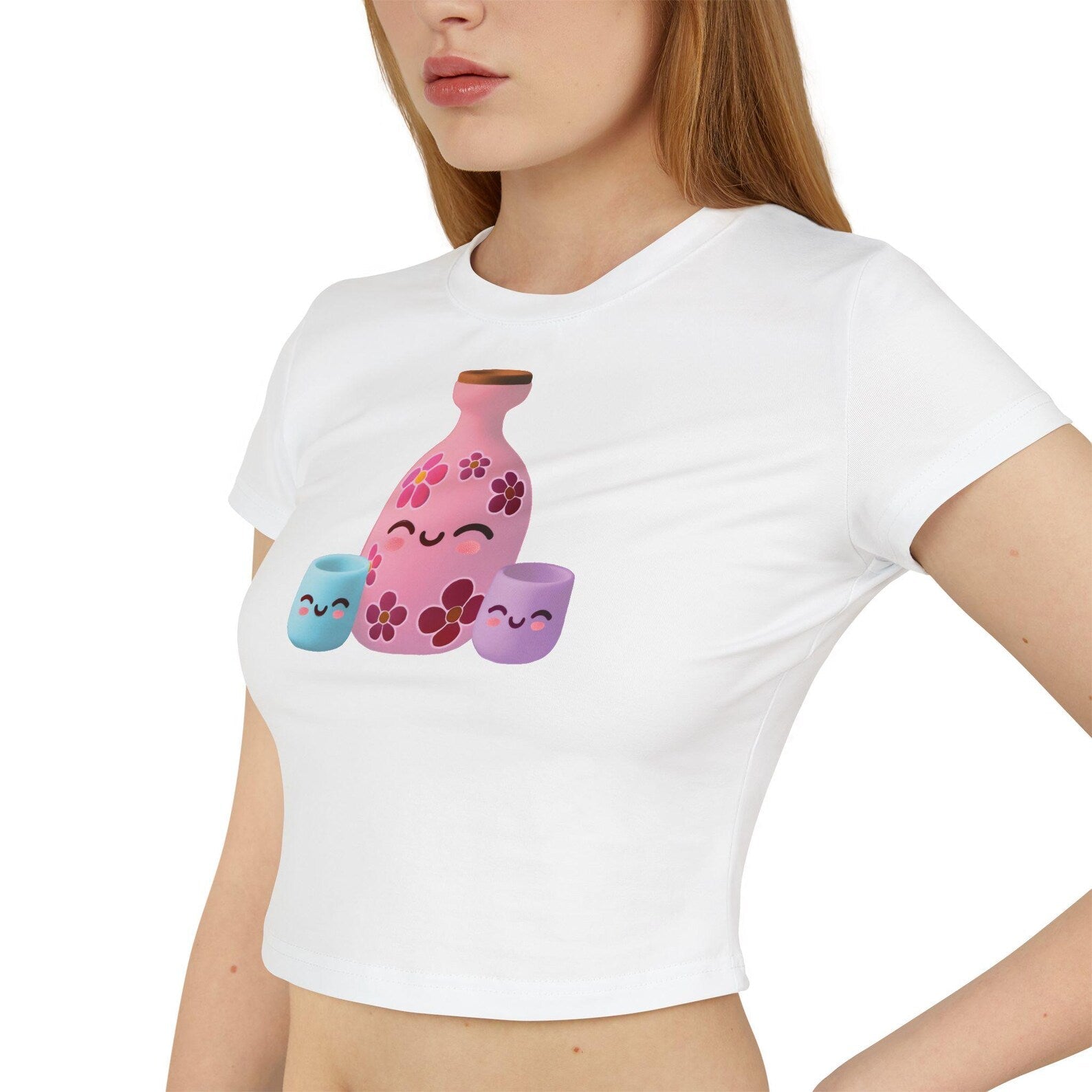 Add a touch of kawaii to your wardrobe with this adorable baby tee featuring a smiling sake...