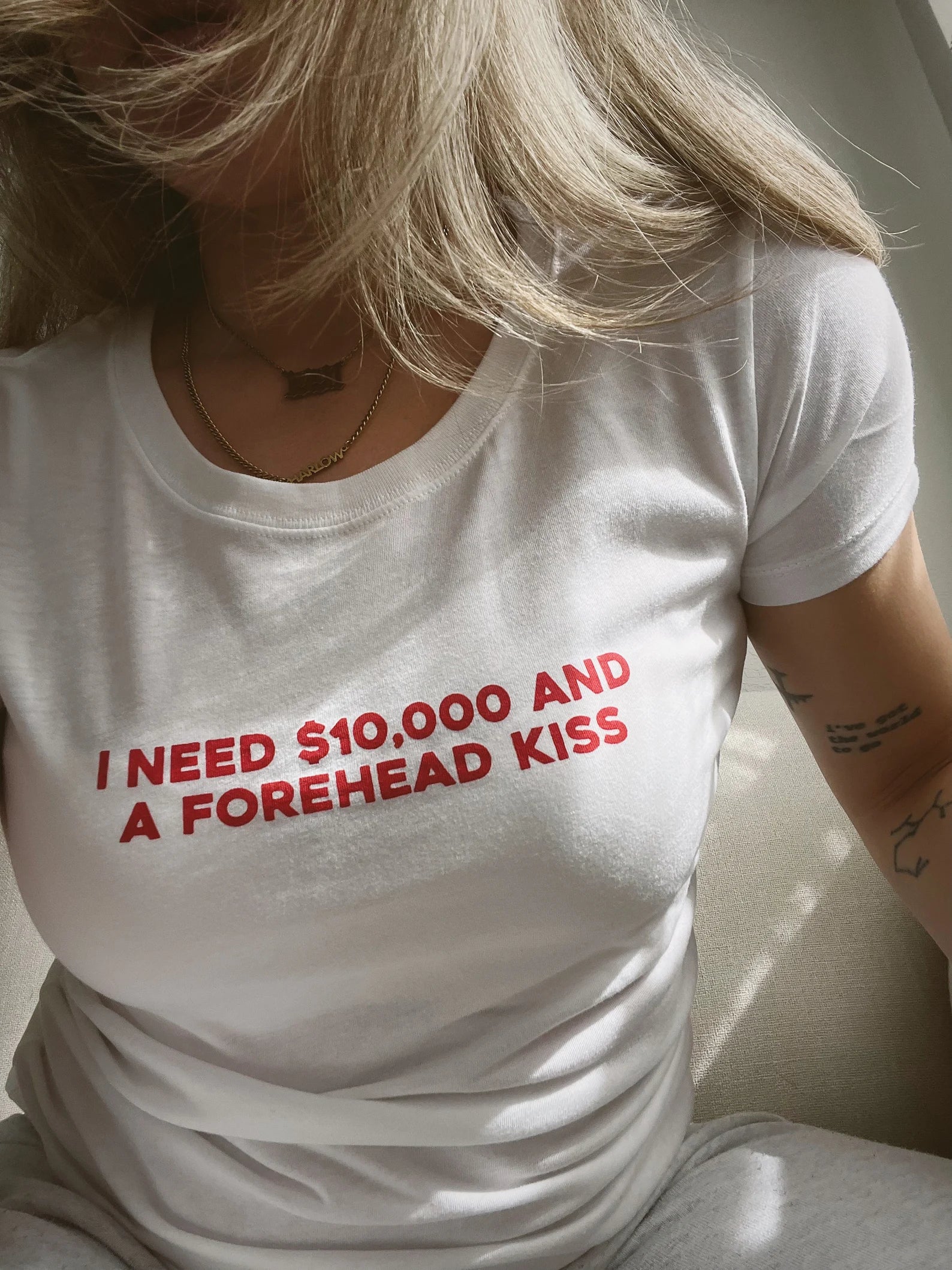 I Need $10,000 and a Forehead Kiss” Baby Tee – Trendy Statement Color White