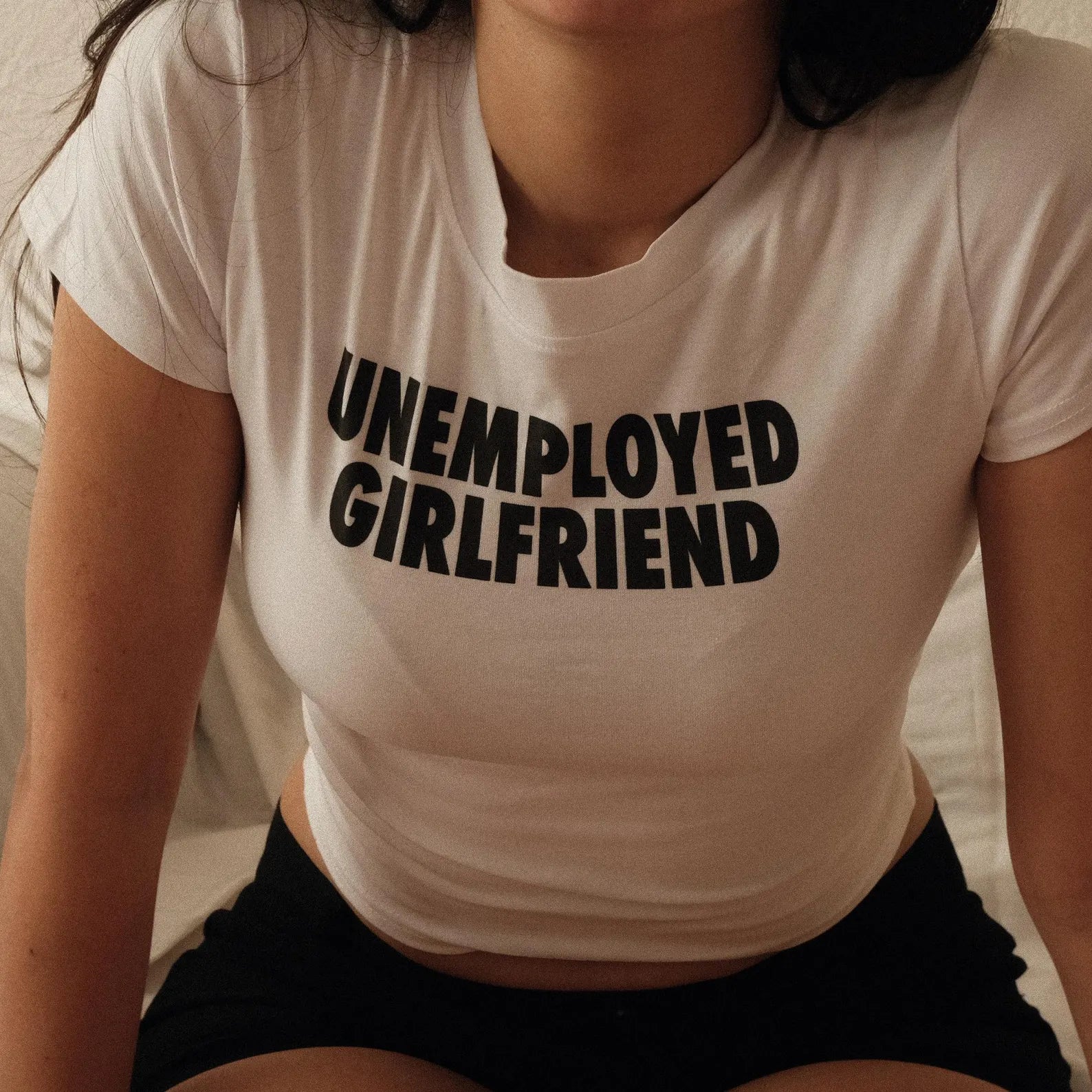 Unemployed Girlfriend Baby Tee – Funny & Trendy Cropped T-Shirt Color White